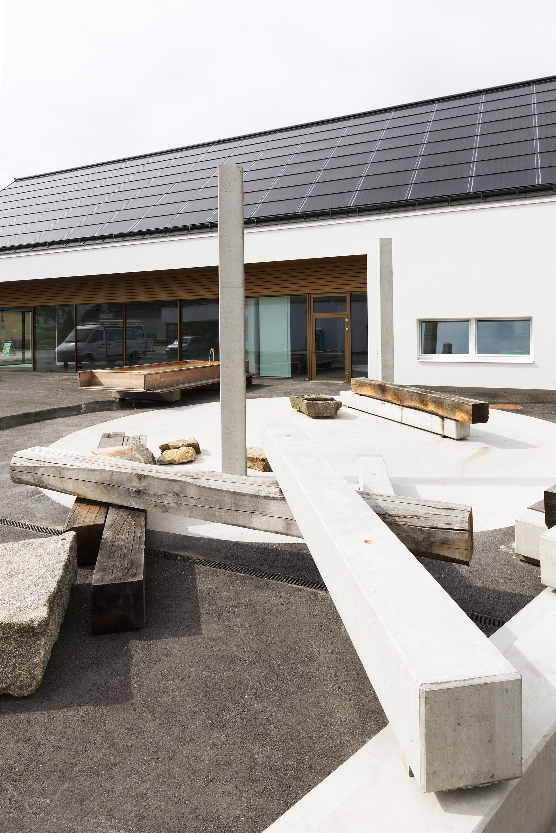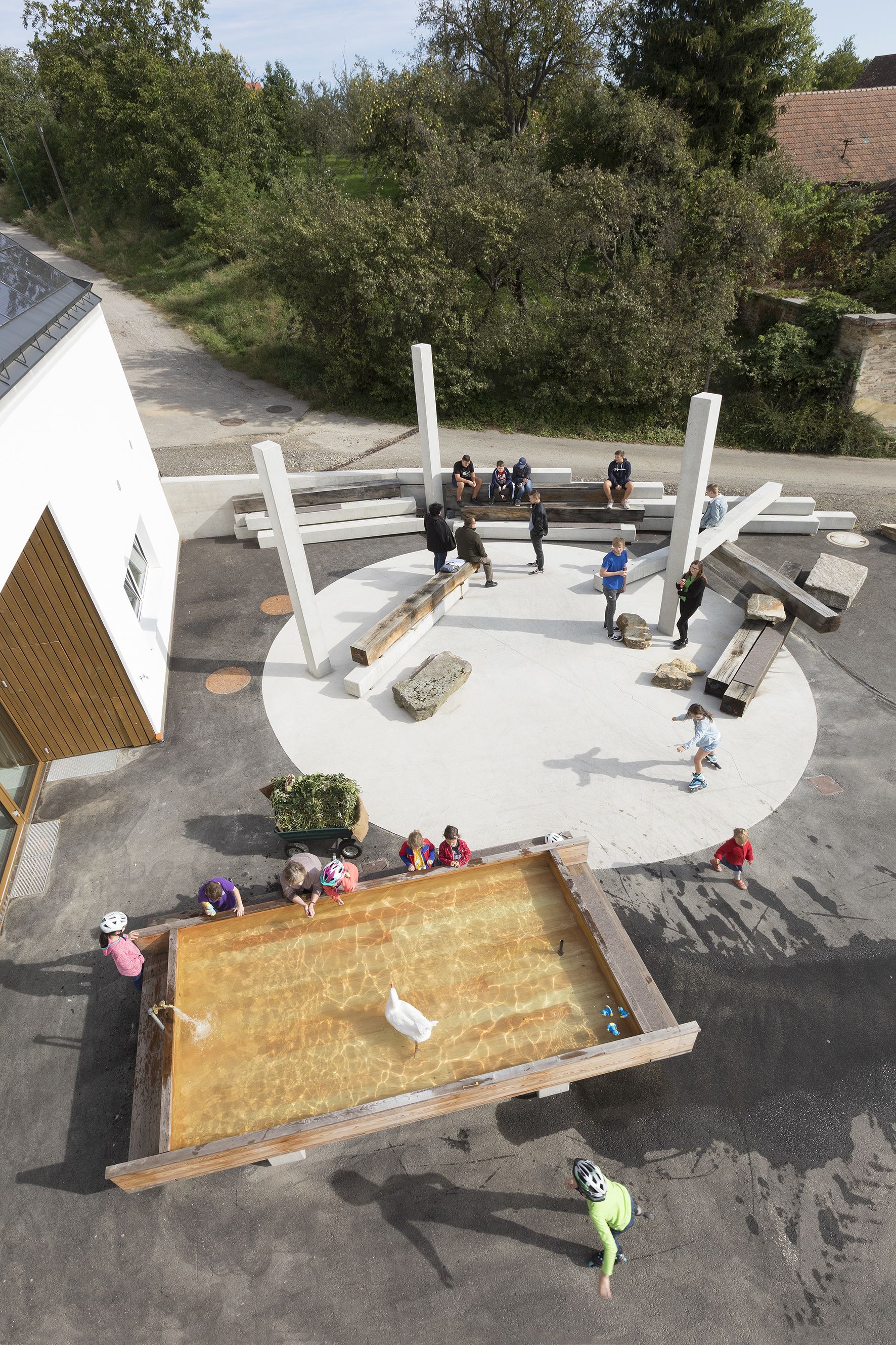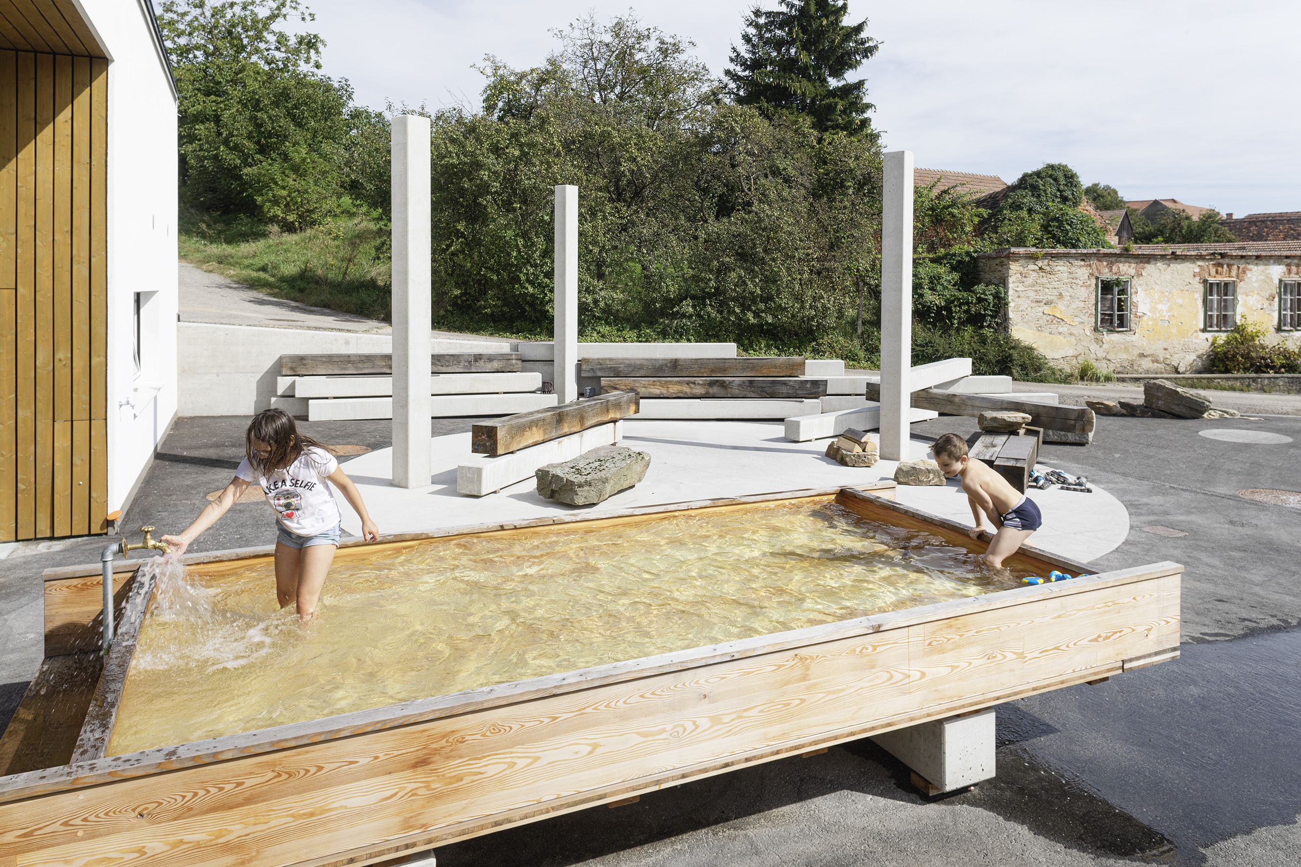 The square is defined by elements designed by the artist duo Nicole Six and Paul Petritsch. Their design proposal was the winner of an invitation-only call to artists organized by Public Art Lower Austria. Six and Petritsch have developed a space full of possibilities with a structure for social life. The design of the square is essentially based on three elements that anchor it in several underlying narratives about humanity and our relationship to the world. The components are designed to promote the shared use of the square and consist of a campfire circle on polished concrete, a fountain made of larch wood the size of a parking space, and scattered heavy oak beams and prefabricated concrete elements to sit on. The moveable elements can be playfully rearranged with tractors and forklifts. They can be stacked like oversized Mikado sticks, or they can be moved around to serve as seats, stands, a bar, or as demarcations, according to the village’s needs.