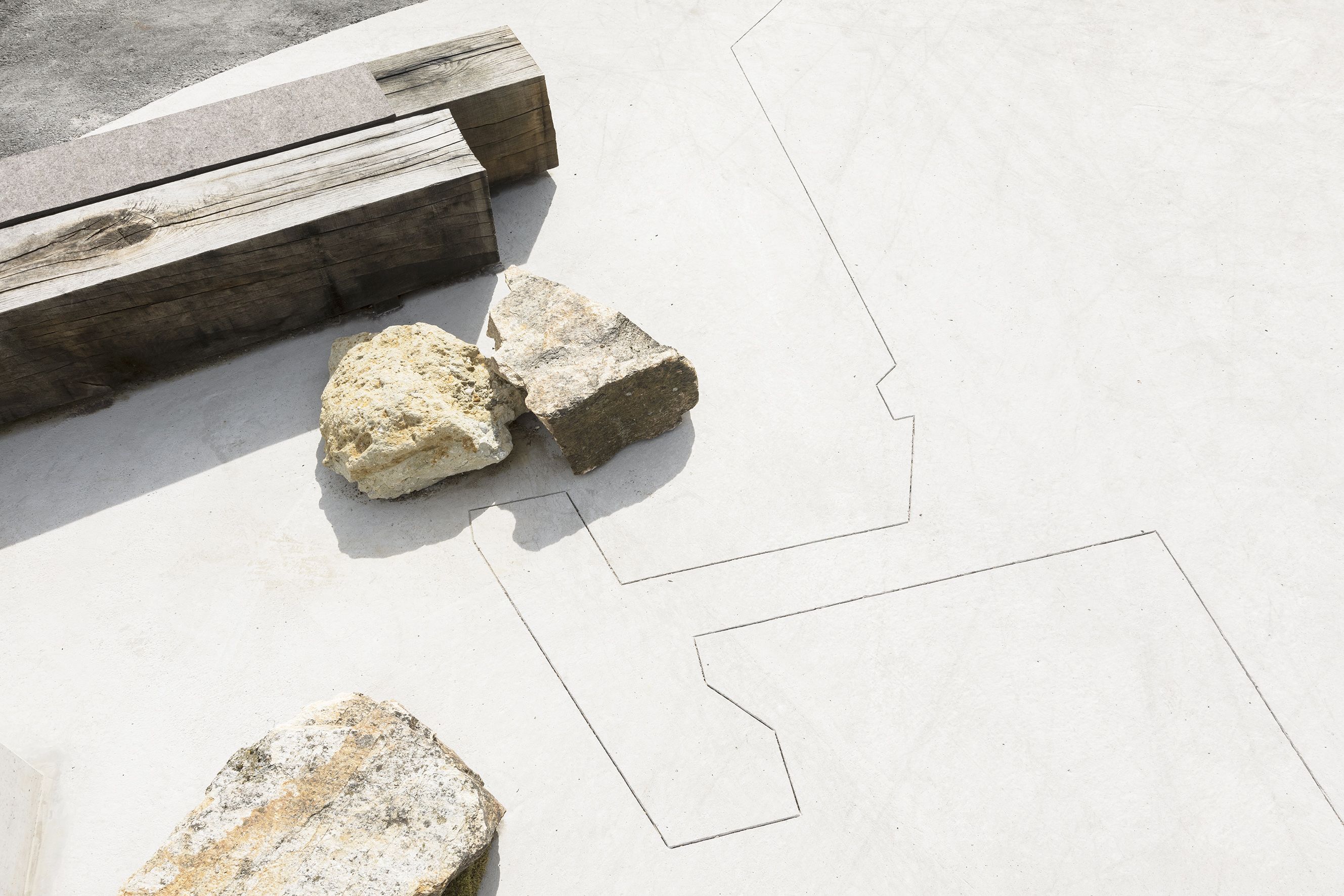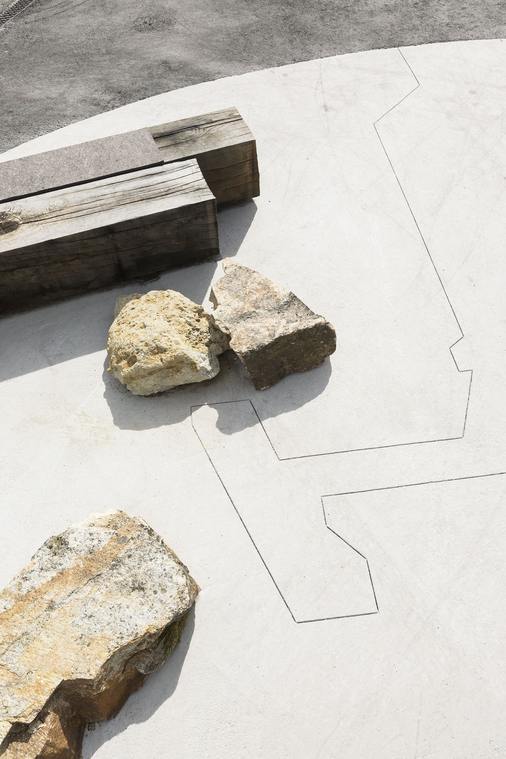 The square features three vertical concrete pillars. In one corner is a charging station for mobile phones and laptops disguised as rock, Flintstones-style. There are also several rocks from the nearby quarry as well as the historical sandpit near Kühnring, where the skeletons of a herd of manatees were found that lived there 20 million years ago on the coast of the tropical Eggenburg Sea. The result is a layering of, or juxtaposition between, different objects and references that raise our awareness of the various levels of time.