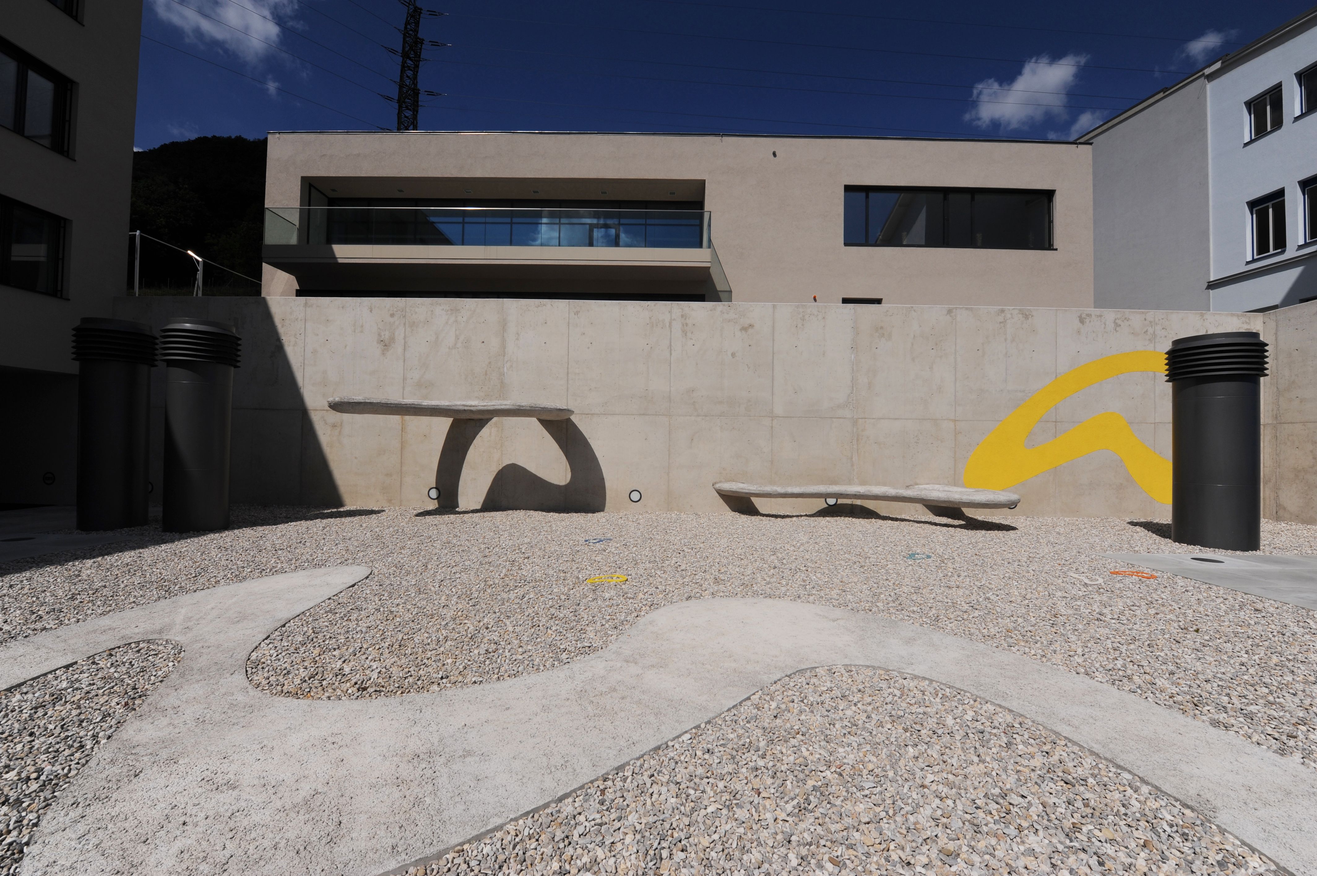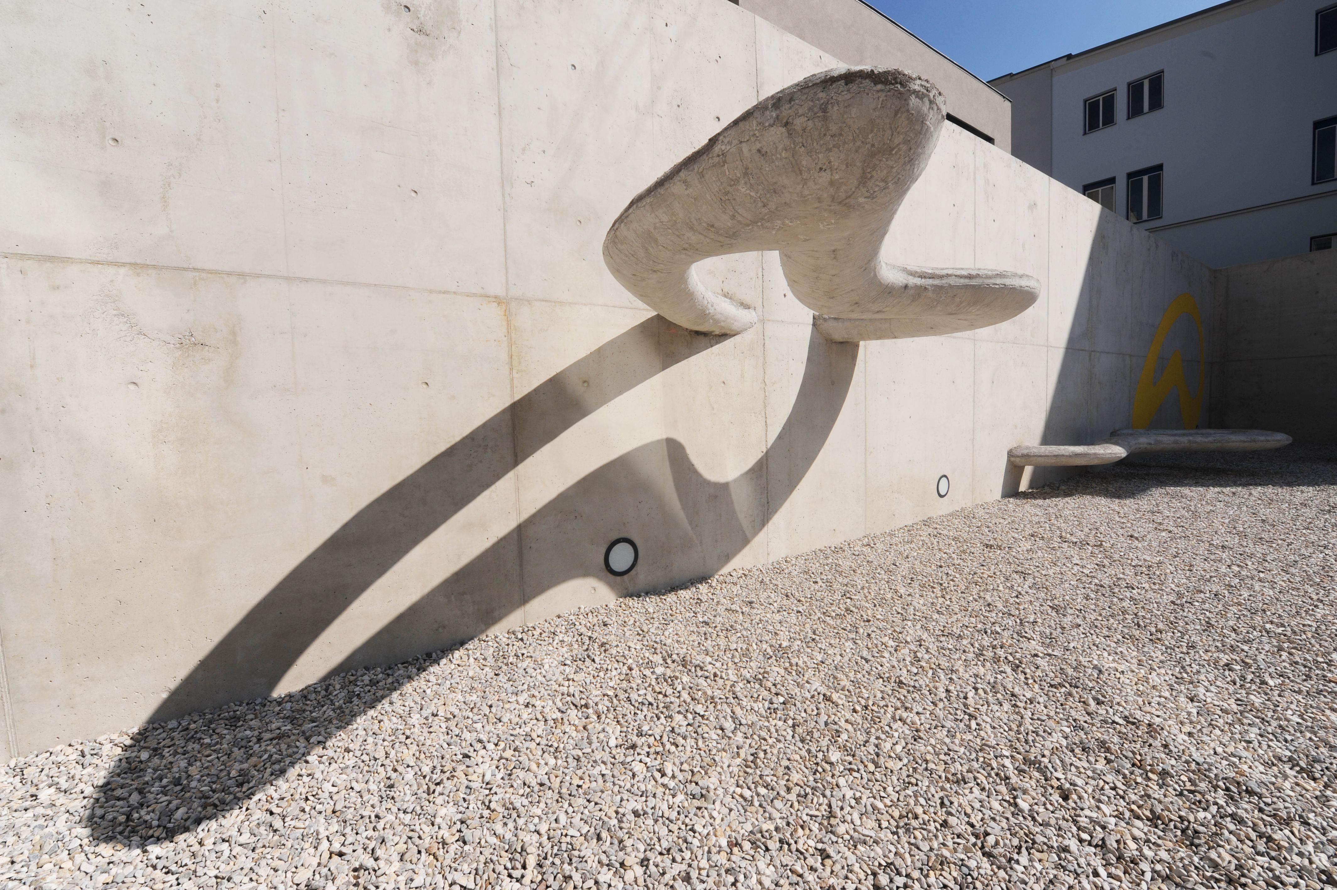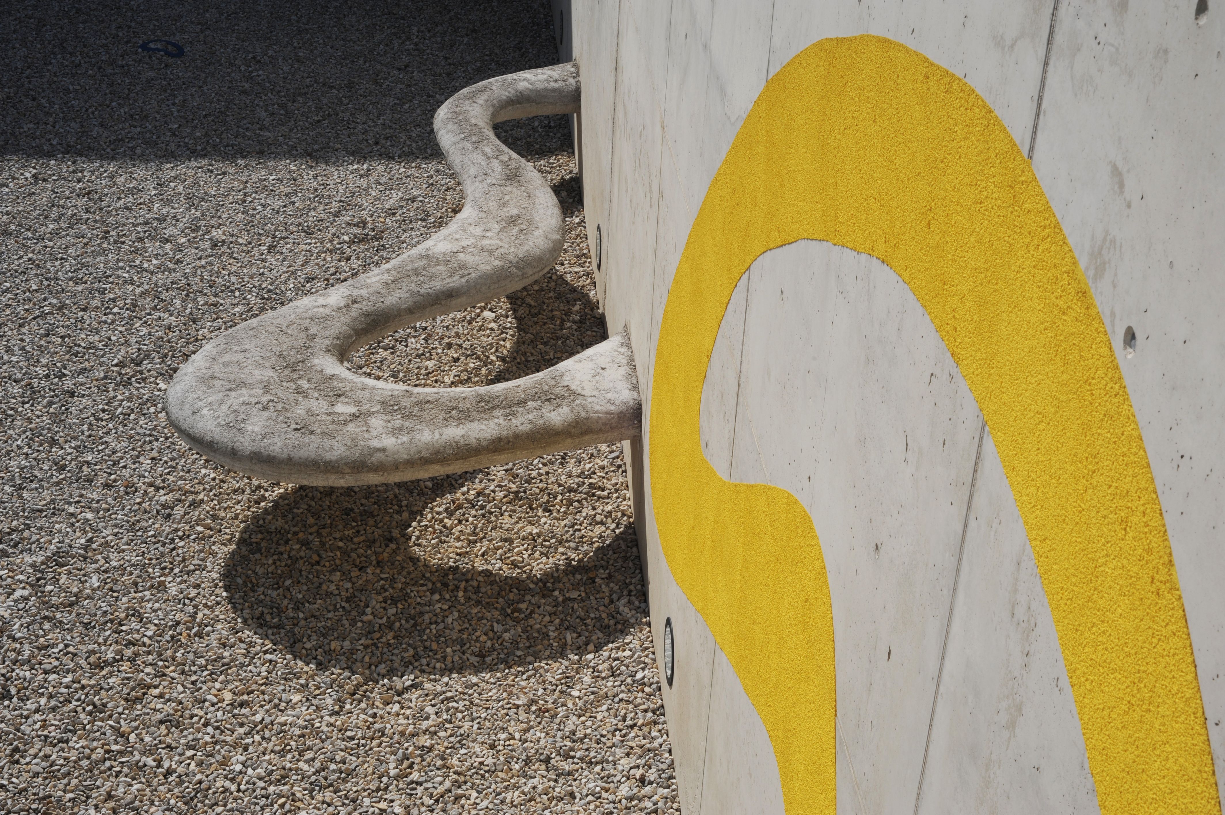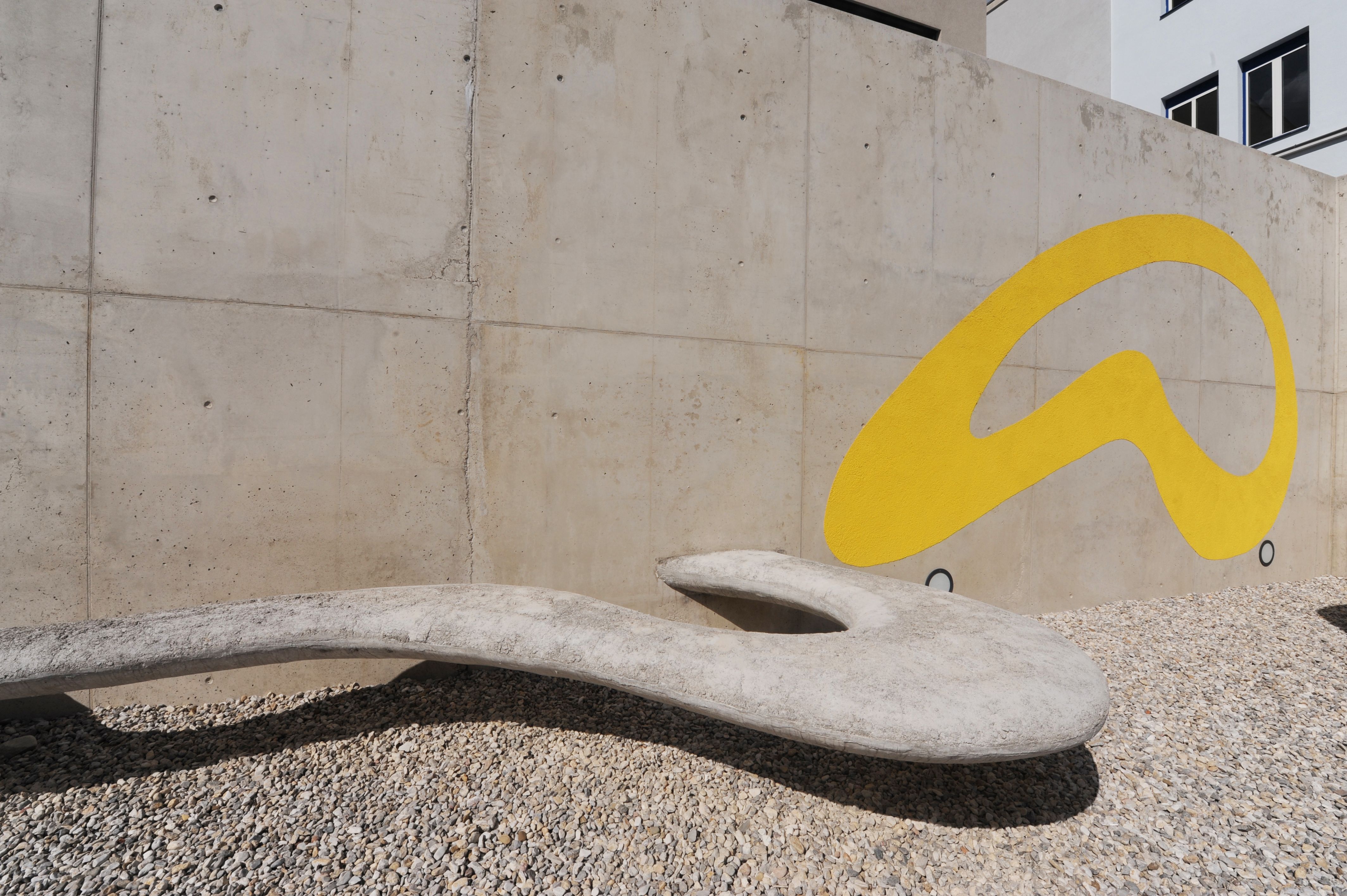 "Four elements characterize mischla. All of them share the basic form of the circle but have been altered into playful variations – like when playing with a rubber band. One of these possibilities is chosen and then explored. There are thus three cast-in-place concrete elements in the courtyard. Two of these forms are similar and seem to cut into the wall or grow out of it in different ways. Their forms are tapered, and all edges of the concrete sculptures that you can sit or climb on have an organic shape. These heavy elements are directly connected to the load-bearing construction with iron braces in and behind the concrete wall, and yet they seem to float. 'mischla' also visualizes the changing angle of the sunlight throughout the day, and the sculptural ensemble casts a constantly changing shadow on the wall and the gravel surface of the courtyard. This dynamic is also directly absorbed by the wall through a similar form in bright yellow paint made with granular wall plaster. The surface texture and the color contrast with the wall and the protruding elements, while emphasizing them at the same time. 'mischla' also interacts with the other heterogenic plaster facades surrounding it . The third cast-in-place concrete form is on the ground of the courtyard and can be walked on. [...] It looks like a shadow of the other elements seen from above. Embedded in the rough, colorful gravel, it highlights the thickness of the gym ceiling and the space beneath it. [...] Sixteen small stoneware forms with colored glazes in orange, blue, white, yellow, and turquois interact with the large concrete forms. They are spread out over the entire courtyard in an enchanting play of scales."