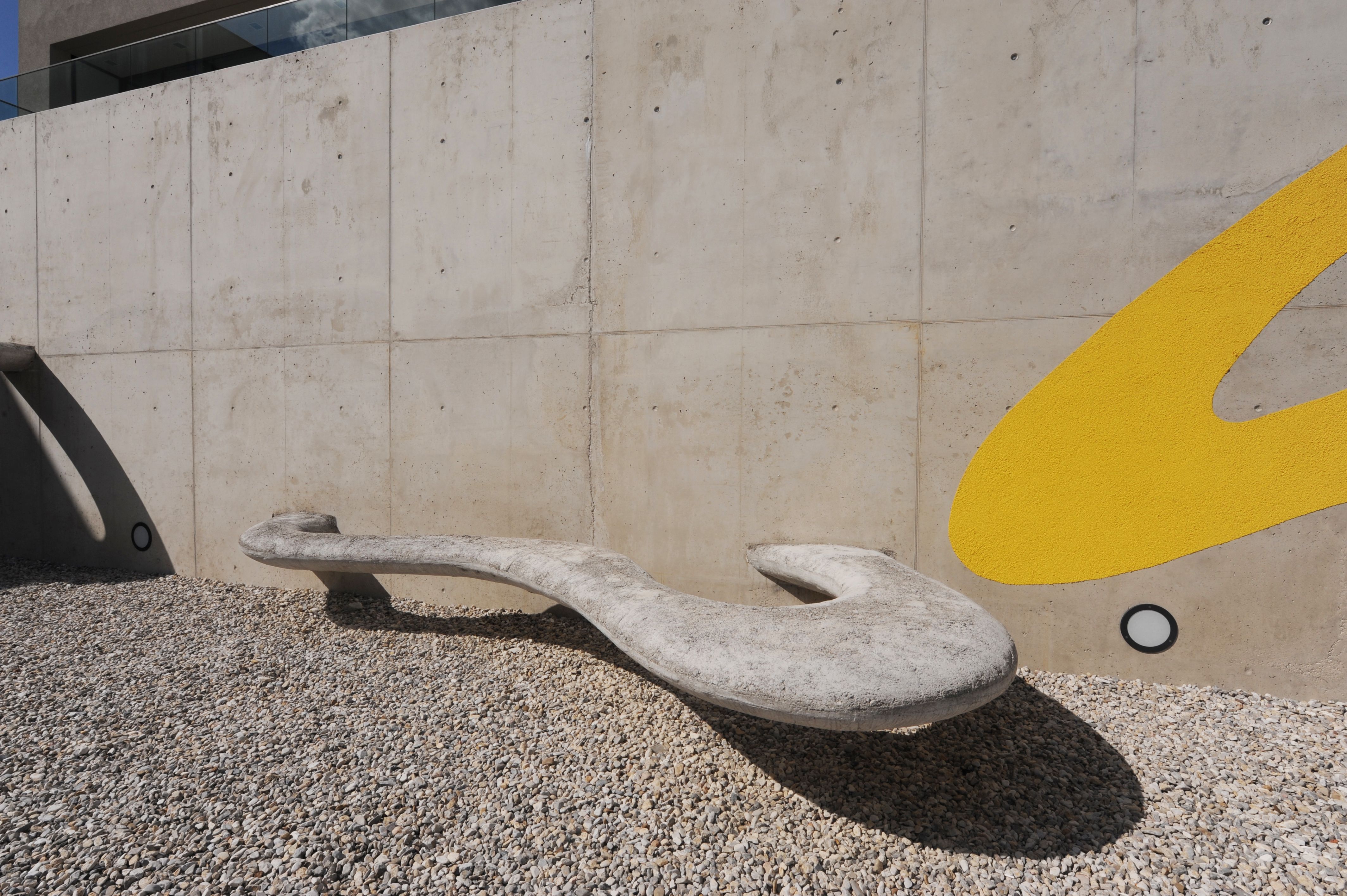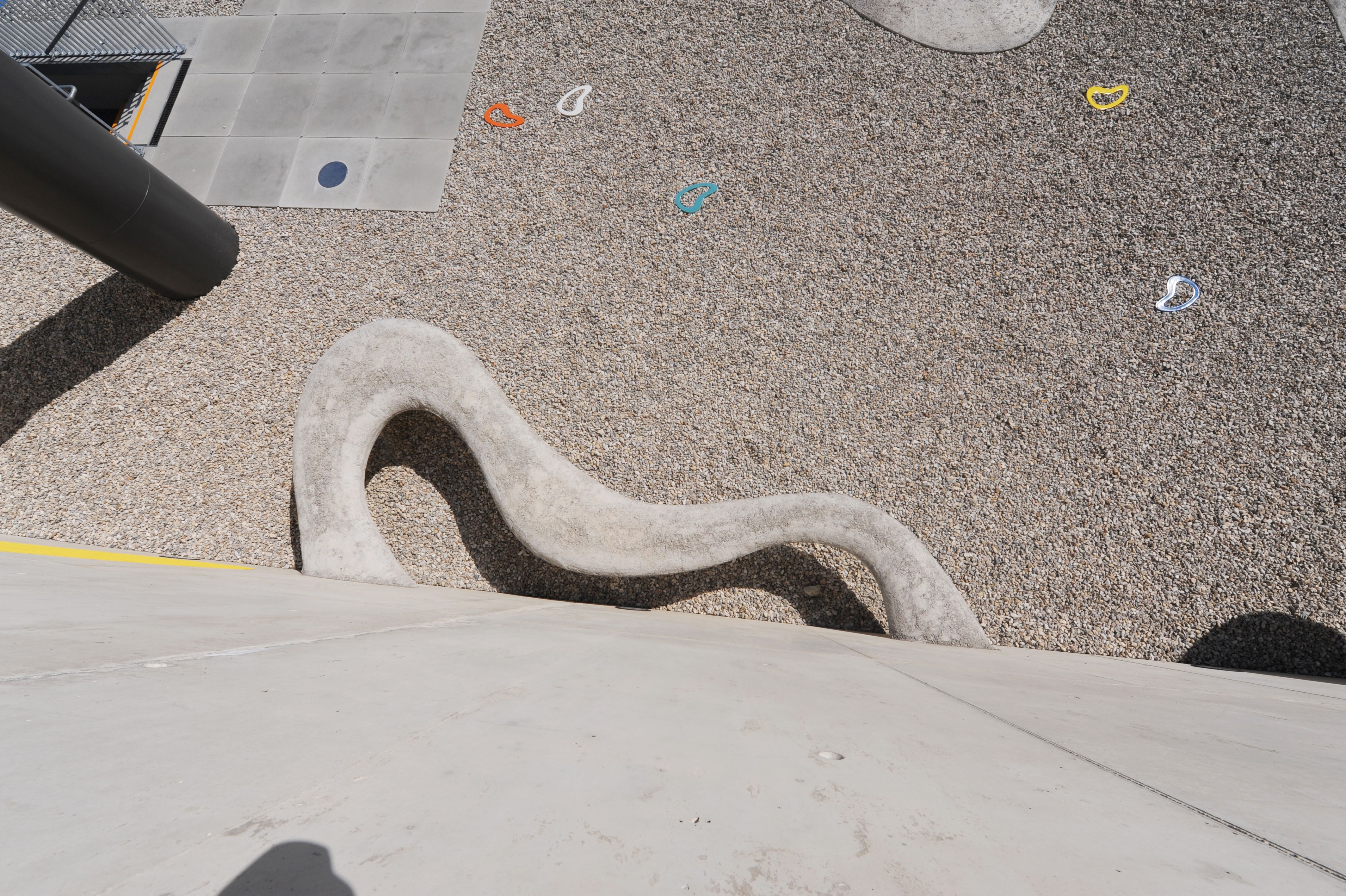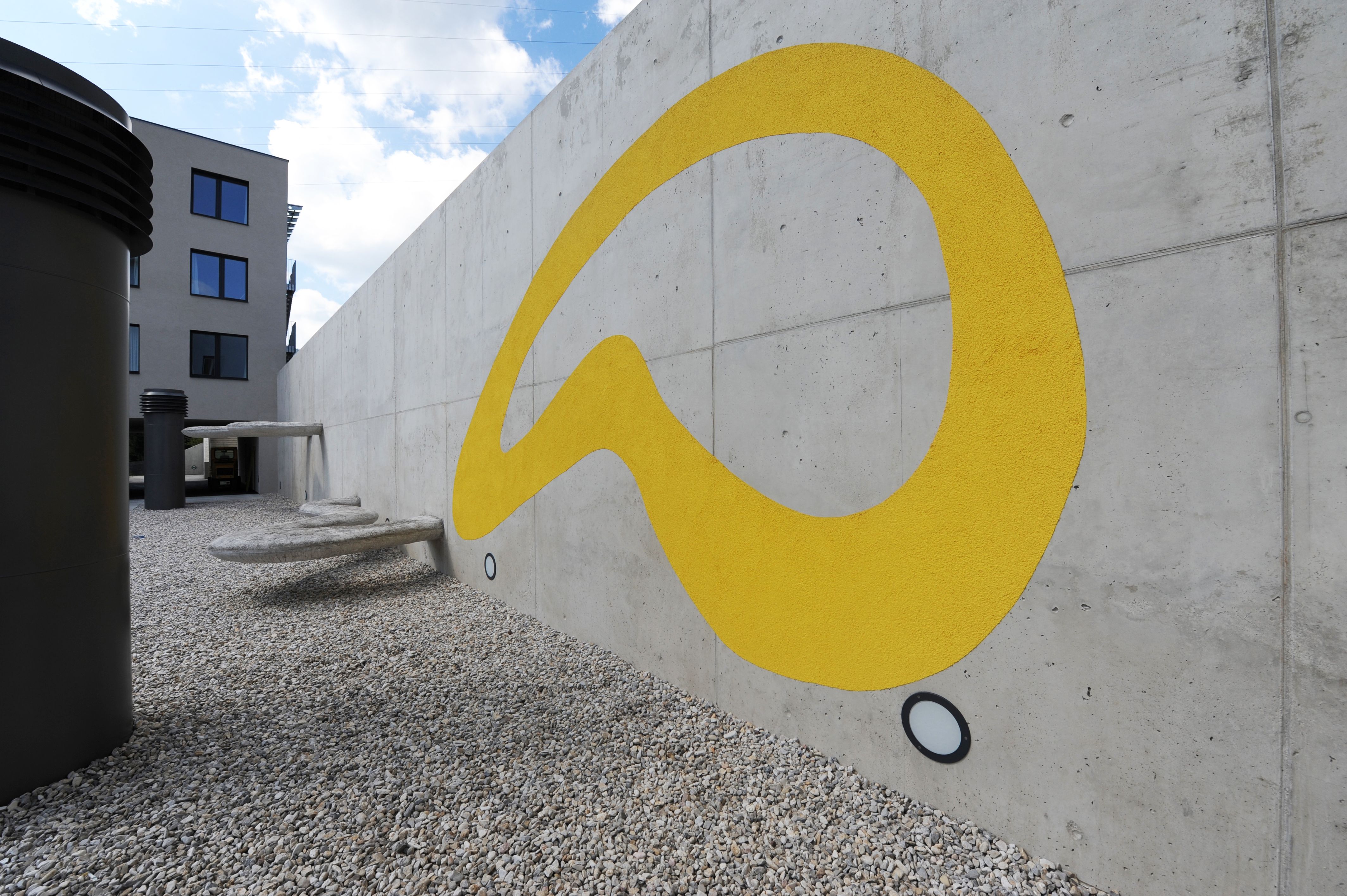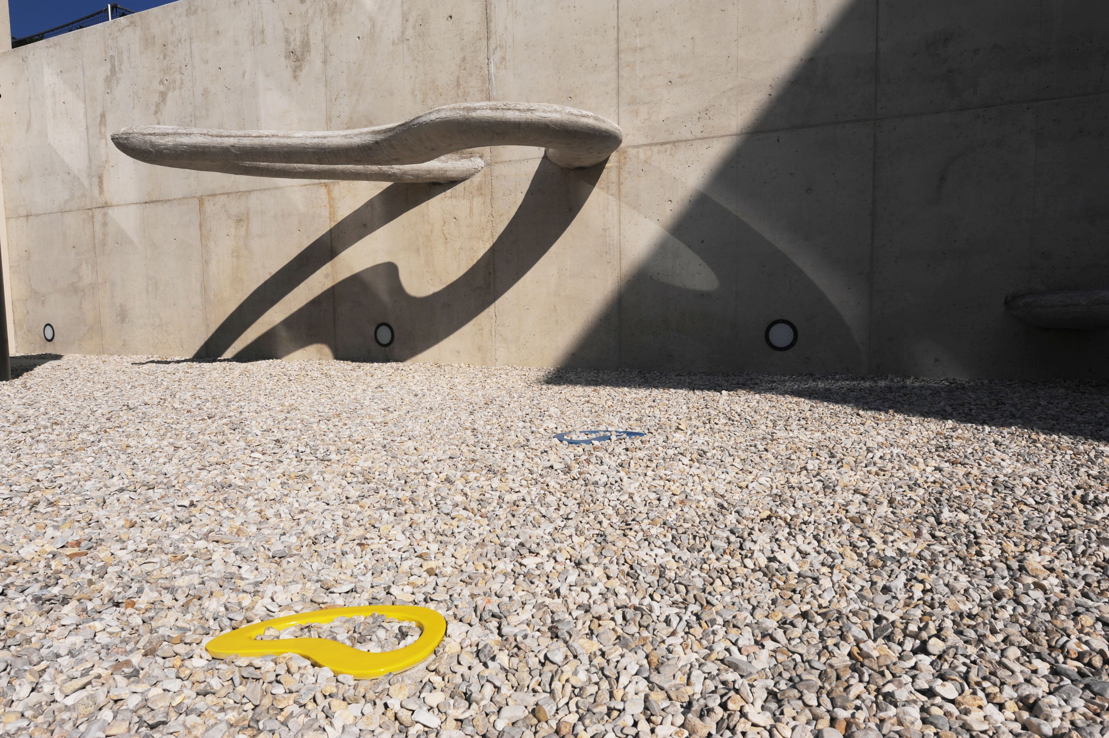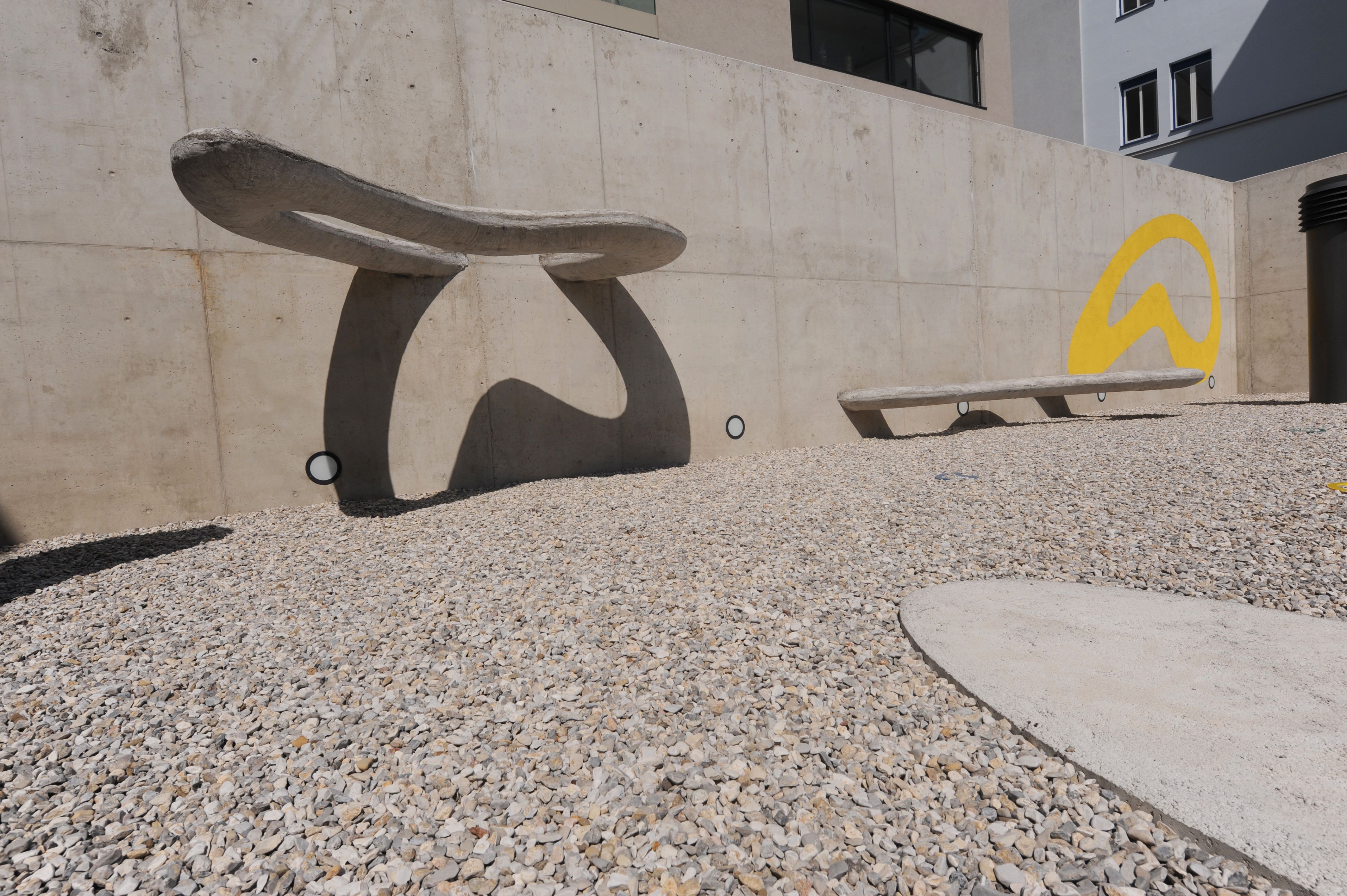 "Four elements characterize mischla. All of them share the basic form of the circle but have been altered into playful variations – like when playing with a rubber band. One of these possibilities is chosen and then explored. There are thus three cast-in-place concrete elements in the courtyard. Two of these forms are similar and seem to cut into the wall or grow out of it in different ways. Their forms are tapered, and all edges of the concrete sculptures that you can sit or climb on have an organic shape. These heavy elements are directly connected to the load-bearing construction with iron braces in and behind the concrete wall, and yet they seem to float. 'mischla' also visualizes the changing angle of the sunlight throughout the day, and the sculptural ensemble casts a constantly changing shadow on the wall and the gravel surface of the courtyard. This dynamic is also directly absorbed by the wall through a similar form in bright yellow paint made with granular wall plaster. The surface texture and the color contrast with the wall and the protruding elements, while emphasizing them at the same time. 'mischla' also interacts with the other heterogenic plaster facades surrounding it . The third cast-in-place concrete form is on the ground of the courtyard and can be walked on. [...] It looks like a shadow of the other elements seen from above. Embedded in the rough, colorful gravel, it highlights the thickness of the gym ceiling and the space beneath it. [...] Sixteen small stoneware forms with colored glazes in orange, blue, white, yellow, and turquois interact with the large concrete forms. They are spread out over the entire courtyard in an enchanting play of scales."