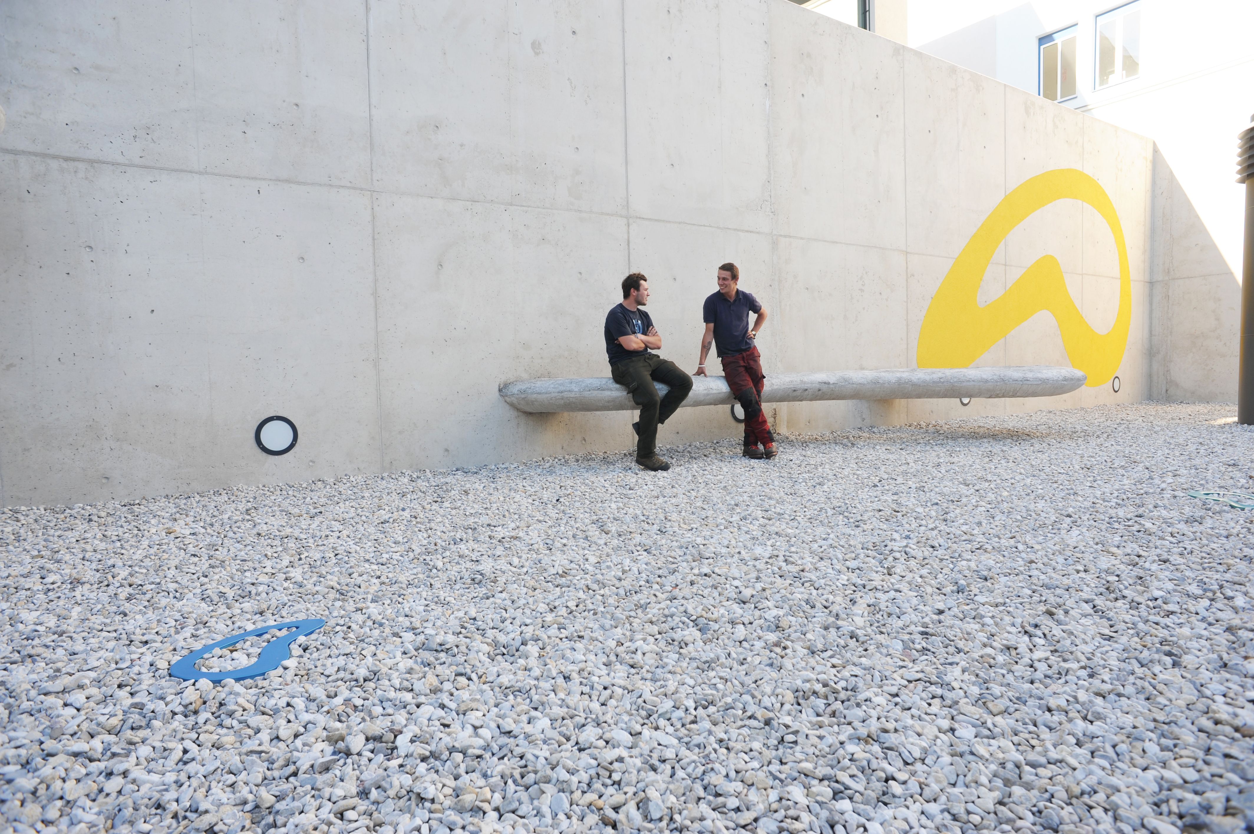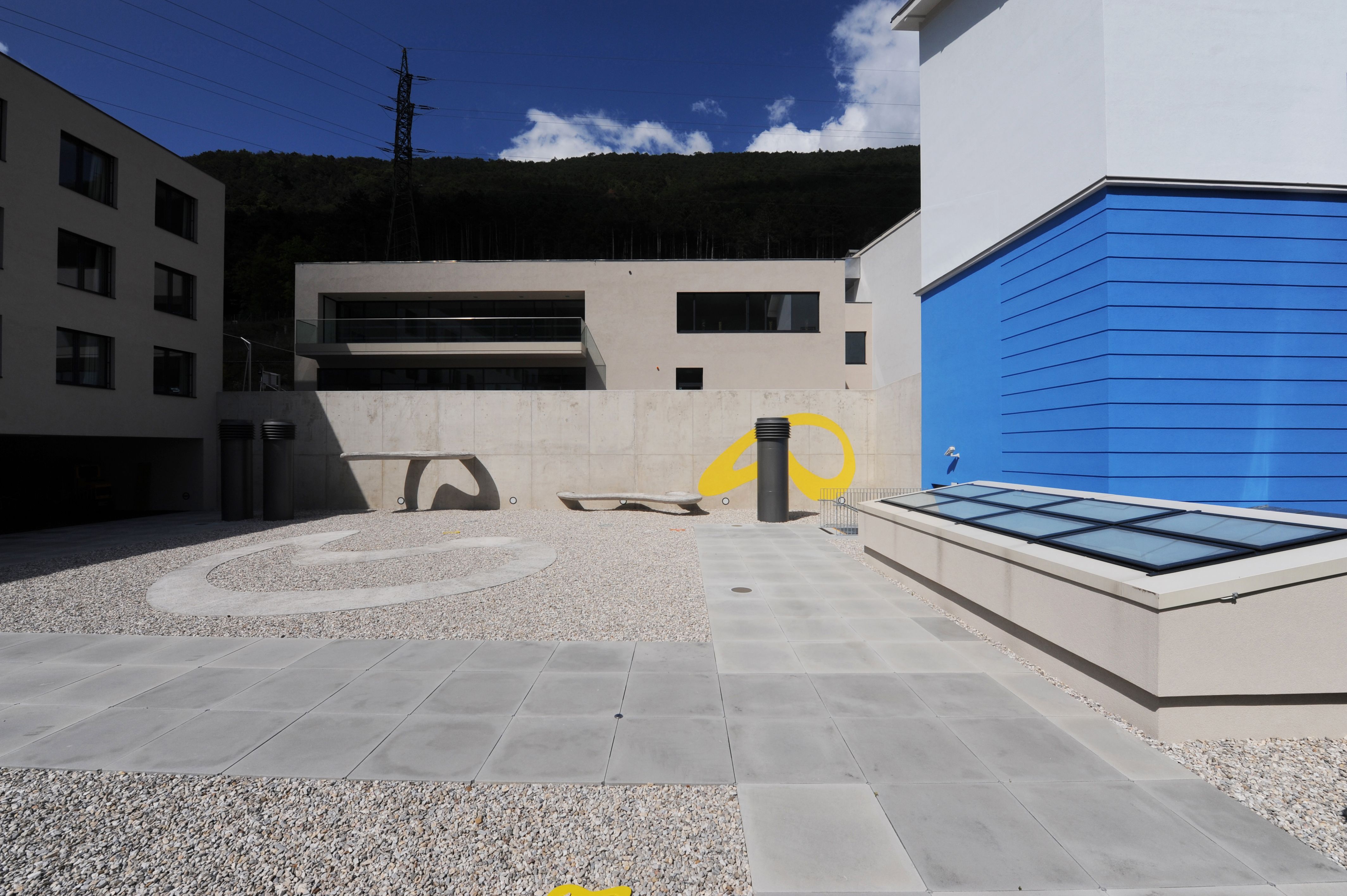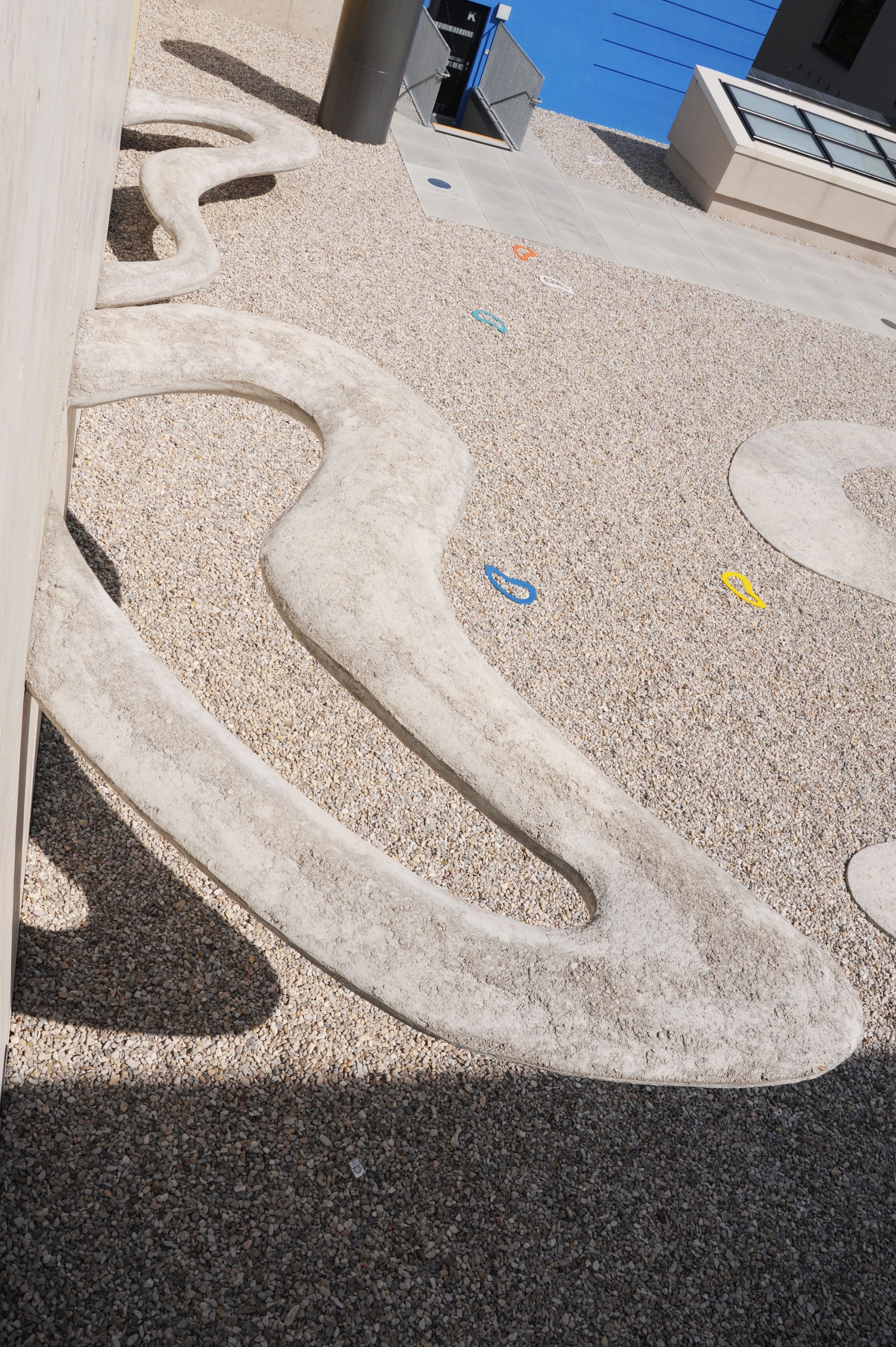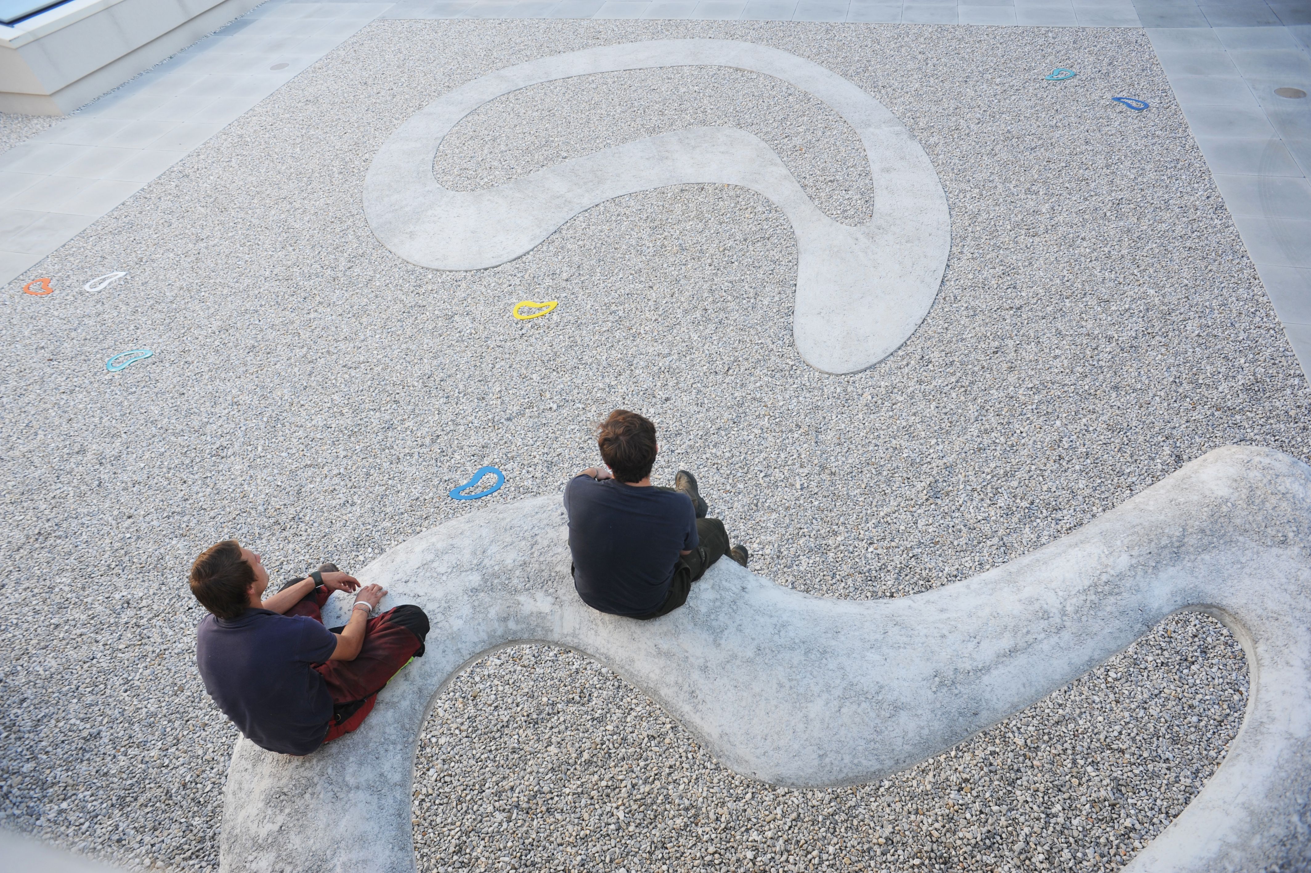"Four elements characterize mischla. All of them share the basic form of the circle but have been altered into playful variations – like when playing with a rubber band. One of these possibilities is chosen and then explored. There are thus three cast-in-place concrete elements in the courtyard. Two of these forms are similar and seem to cut into the wall or grow out of it in different ways. Their forms are tapered, and all edges of the concrete sculptures that you can sit or climb on have an organic shape. These heavy elements are directly connected to the load-bearing construction with iron braces in and behind the concrete wall, and yet they seem to float. 'mischla' also visualizes the changing angle of the sunlight throughout the day, and the sculptural ensemble casts a constantly changing shadow on the wall and the gravel surface of the courtyard. This dynamic is also directly absorbed by the wall through a similar form in bright yellow paint made with granular wall plaster. The surface texture and the color contrast with the wall and the protruding elements, while emphasizing them at the same time. 'mischla' also interacts with the other heterogenic plaster facades surrounding it . The third cast-in-place concrete form is on the ground of the courtyard and can be walked on. [...] It looks like a shadow of the other elements seen from above. Embedded in the rough, colorful gravel, it highlights the thickness of the gym ceiling and the space beneath it. [...] Sixteen small stoneware forms with colored glazes in orange, blue, white, yellow, and turquois interact with the large concrete forms. They are spread out over the entire courtyard in an enchanting play of scales."