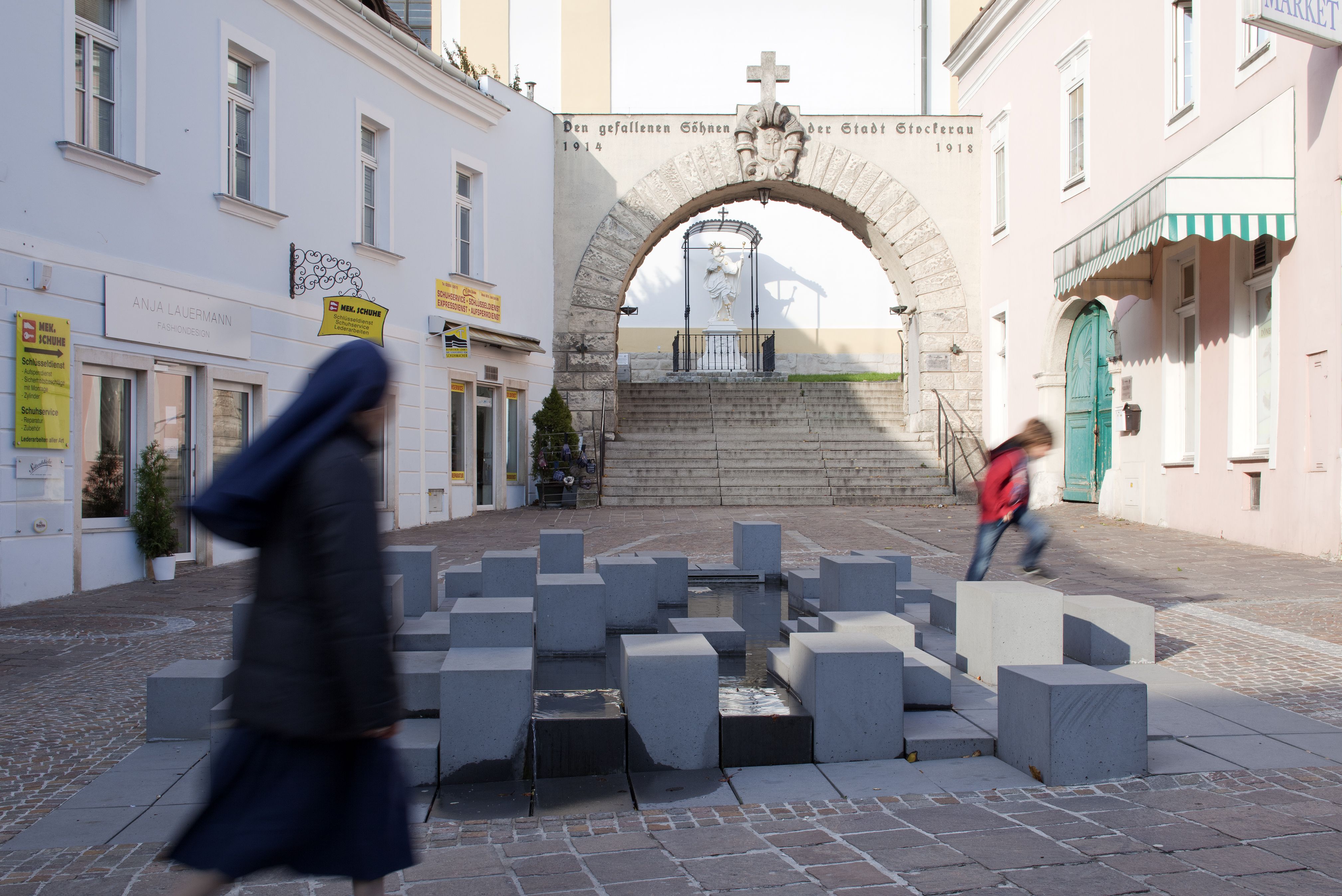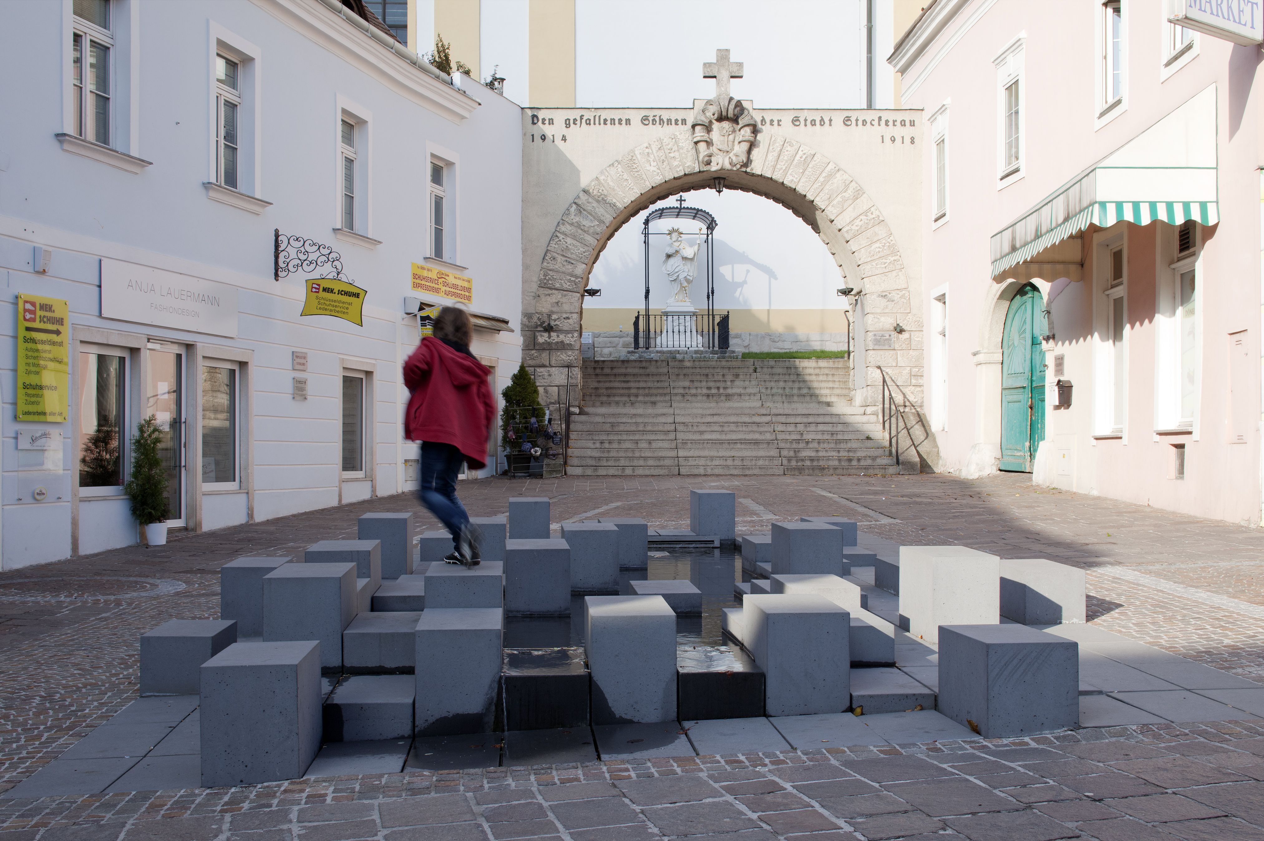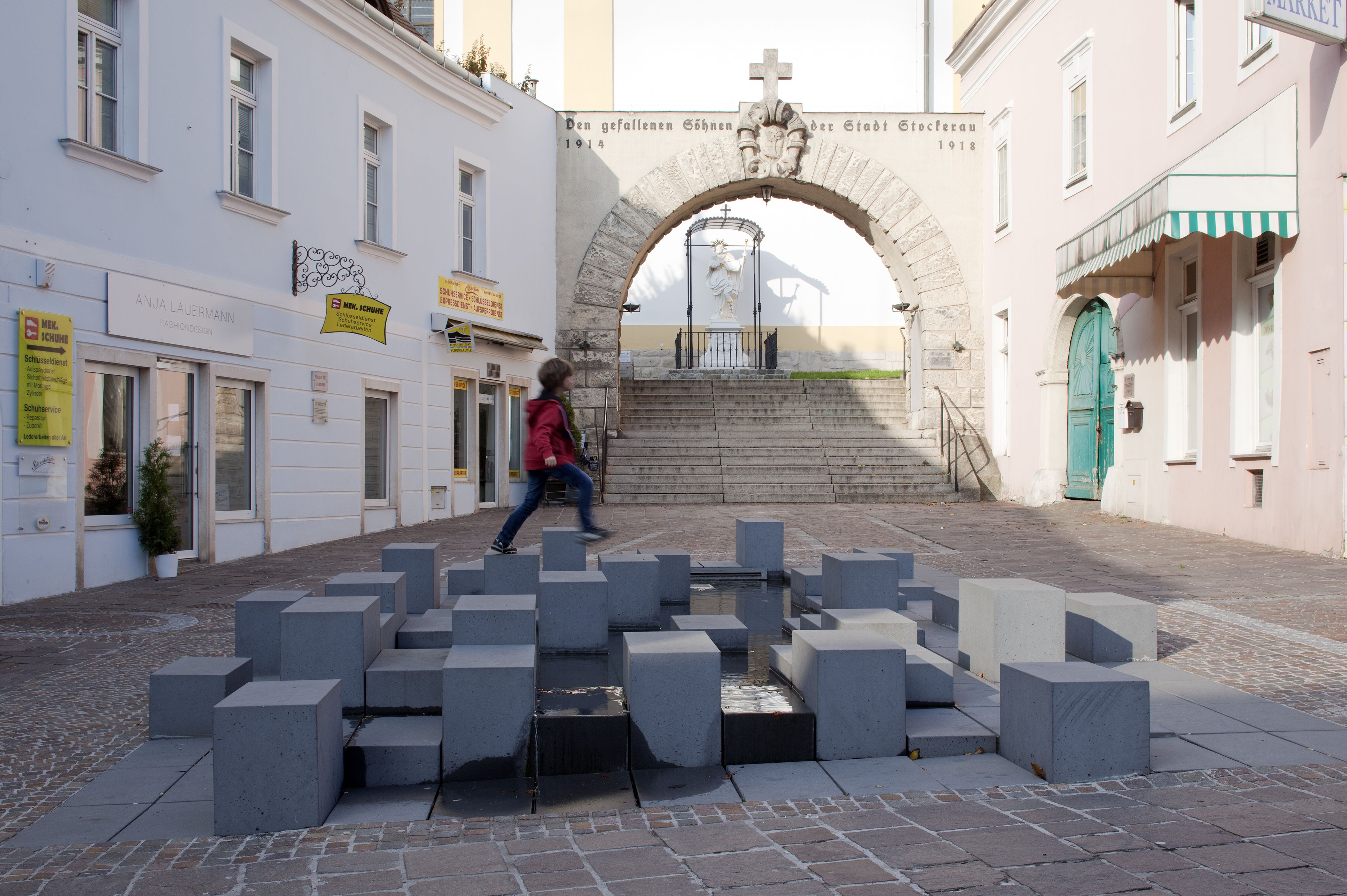 The thematic point of departure for Sandbichler’s sculpture Schwarze Schafe is the legend of Saint Coloman. The legend tells the story of a pilgrim from Ireland who was passing through Stockerau on his way to the Holy Land. Because he was different, spoke a foreign language, and wore unfamiliar clothes, he was taken for a traitor by the locals, and they sentenced him to death. Legend has it that Coloman’s body would not decompose, and several miracles occurred around it. For this reason, Coloman was buried in the new church when it was built in Stockerau and was later canonized. Coloman’s story still serves as a reminder of the dangers racism and xenophobia today, and his relics are held sacred. Peter Sandbichler’s fountain Schwarze Schafe was designed to be more than a mere reference to the town’s history; he also integrated it into the architectural structure of the Kleine Marktplatz in Stockerau, where it was installed. The square-shaped concrete blocks of the fountain resemble the cobblestones of Stockerau’s historical center. These gray elements in different sizes form a reservoir for fresh water. At first glance, they appear to almost seamlessly blend with the square’s overall appearance. However, the artist integrated the square’s slight incline by letting water serve as a balancing element in the fountain. The higher the fountain lies on the incline, the lower the water level appears and vice versa. Peter Sandbichler’s 140 square-shaped concrete blocks thus not only offset the incline of the terrain – they work against it. In addition to the local history and physical conditions of the site, Peter Sandbichler’s Schwarze Schafe also refers to the function of the Kleine Marktplatz in Stockerau. Once a site of social interaction, this square has been used very little by the town’s inhabitants in recent years. It has become a place where people walk through, and it no longer has a special function in the community. Just as the concrete blocks work against the incline, Sandbichler’s act of putting a fountain in a square that no longer has a function in the town was an act of resistance. With Schwarze Schafe, Peter Sandbichler created a sculpture with potential for social interaction. The fountain’s individual elements invite visitors to sit and rest a while, offering Stockerau residents a place to talk with friends. In the spirit of Saint Coloman, whose statue is reflected in the water, the fountain also offers the opportunity to engage with someone new, someone foreign, someone "other". Peter Sandbichler thus makes a proposition to the inhabitants of Stockerau. Whether people who visit the fountain take him up on this offer, whether they will change their position from beholder to user, or whether they will turn this monument reminding us of the dangers of xenophobia into the basis for a discussion and take a stand – whether the fountain will be something for the Stockerauers "to relate to in real life" – remains up to them.