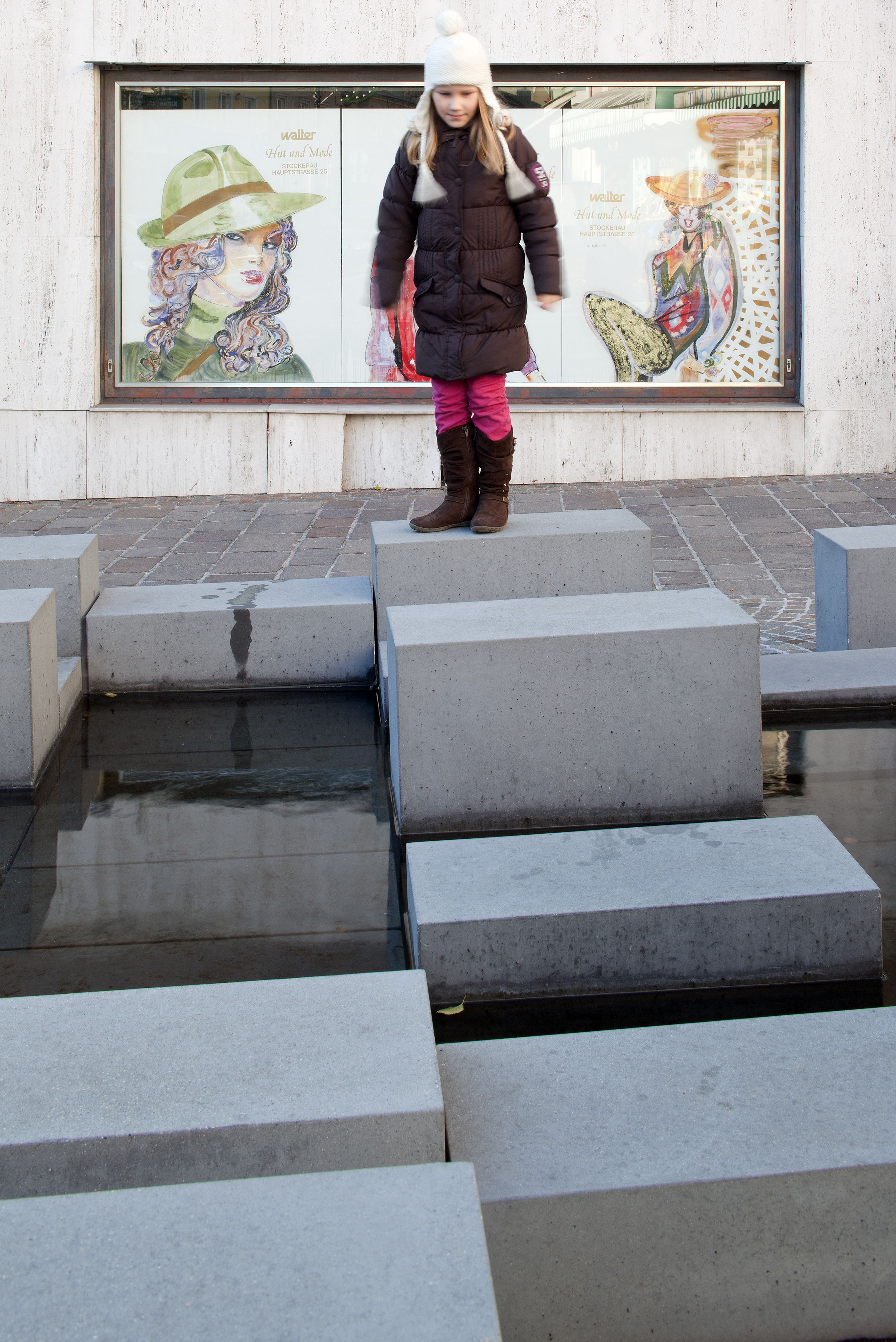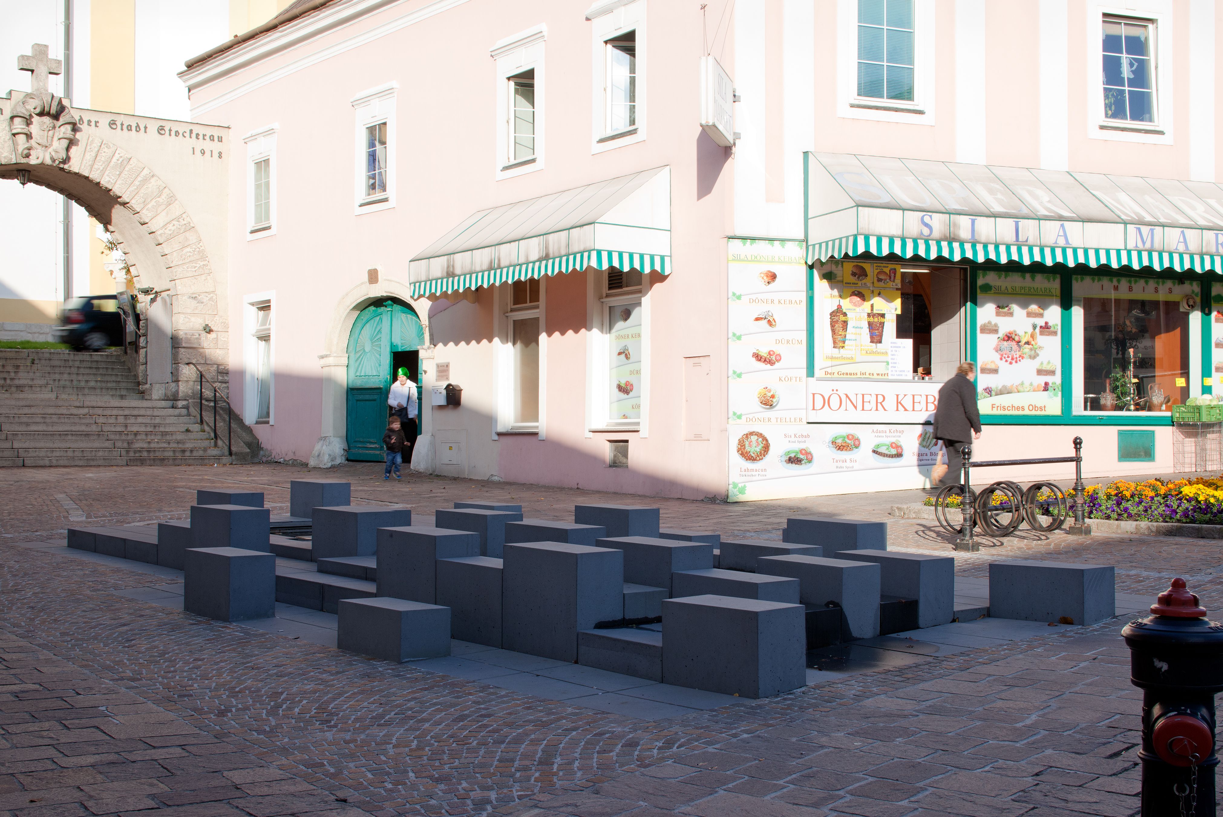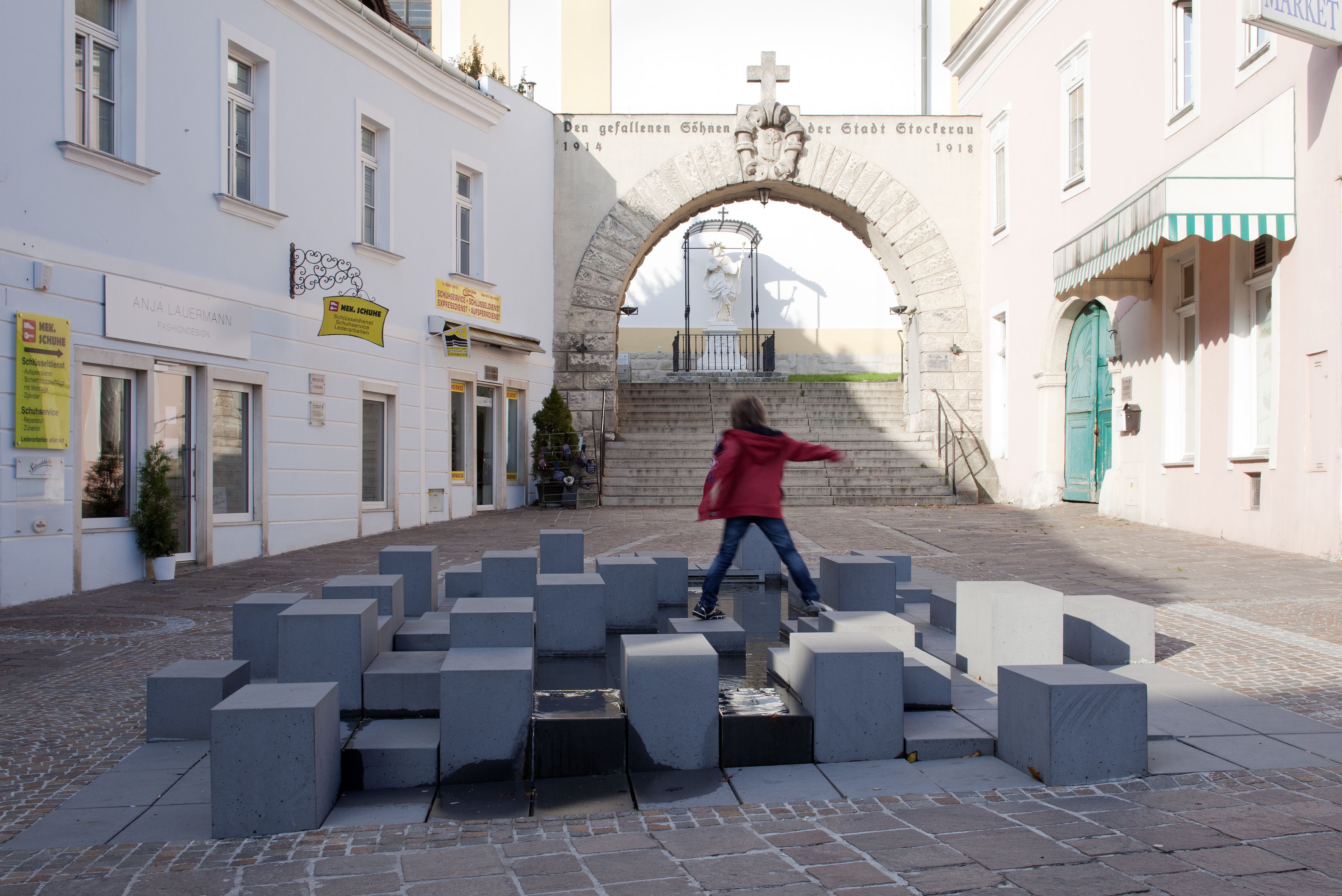 The thematic point of departure for Sandbichler’s sculpture Schwarze Schafe is the legend of Saint Coloman. The legend tells the story of a pilgrim from Ireland who was passing through Stockerau on his way to the Holy Land. Because he was different, spoke a foreign language, and wore unfamiliar clothes, he was taken for a traitor by the locals, and they sentenced him to death. Legend has it that Coloman’s body would not decompose, and several miracles occurred around it. For this reason, Coloman was buried in the new church when it was built in Stockerau and was later canonized. Coloman’s story still serves as a reminder of the dangers racism and xenophobia today, and his relics are held sacred. Peter Sandbichler’s fountain Schwarze Schafe was designed to be more than a mere reference to the town’s history; he also integrated it into the architectural structure of the Kleine Marktplatz in Stockerau, where it was installed. The square-shaped concrete blocks of the fountain resemble the cobblestones of Stockerau’s historical center. These gray elements in different sizes form a reservoir for fresh water. At first glance, they appear to almost seamlessly blend with the square’s overall appearance. However, the artist integrated the square’s slight incline by letting water serve as a balancing element in the fountain. The higher the fountain lies on the incline, the lower the water level appears and vice versa. Peter Sandbichler’s 140 square-shaped concrete blocks thus not only offset the incline of the terrain – they work against it. In addition to the local history and physical conditions of the site, Peter Sandbichler’s Schwarze Schafe also refers to the function of the Kleine Marktplatz in Stockerau. Once a site of social interaction, this square has been used very little by the town’s inhabitants in recent years. It has become a place where people walk through, and it no longer has a special function in the community. Just as the concrete blocks work against the incline, Sandbichler’s act of putting a fountain in a square that no longer has a function in the town was an act of resistance. With Schwarze Schafe, Peter Sandbichler created a sculpture with potential for social interaction. The fountain’s individual elements invite visitors to sit and rest a while, offering Stockerau residents a place to talk with friends. In the spirit of Saint Coloman, whose statue is reflected in the water, the fountain also offers the opportunity to engage with someone new, someone foreign, someone "other". Peter Sandbichler thus makes a proposition to the inhabitants of Stockerau. Whether people who visit the fountain take him up on this offer, whether they will change their position from beholder to user, or whether they will turn this monument reminding us of the dangers of xenophobia into the basis for a discussion and take a stand – whether the fountain will be something for the Stockerauers "to relate to in real life" – remains up to them.