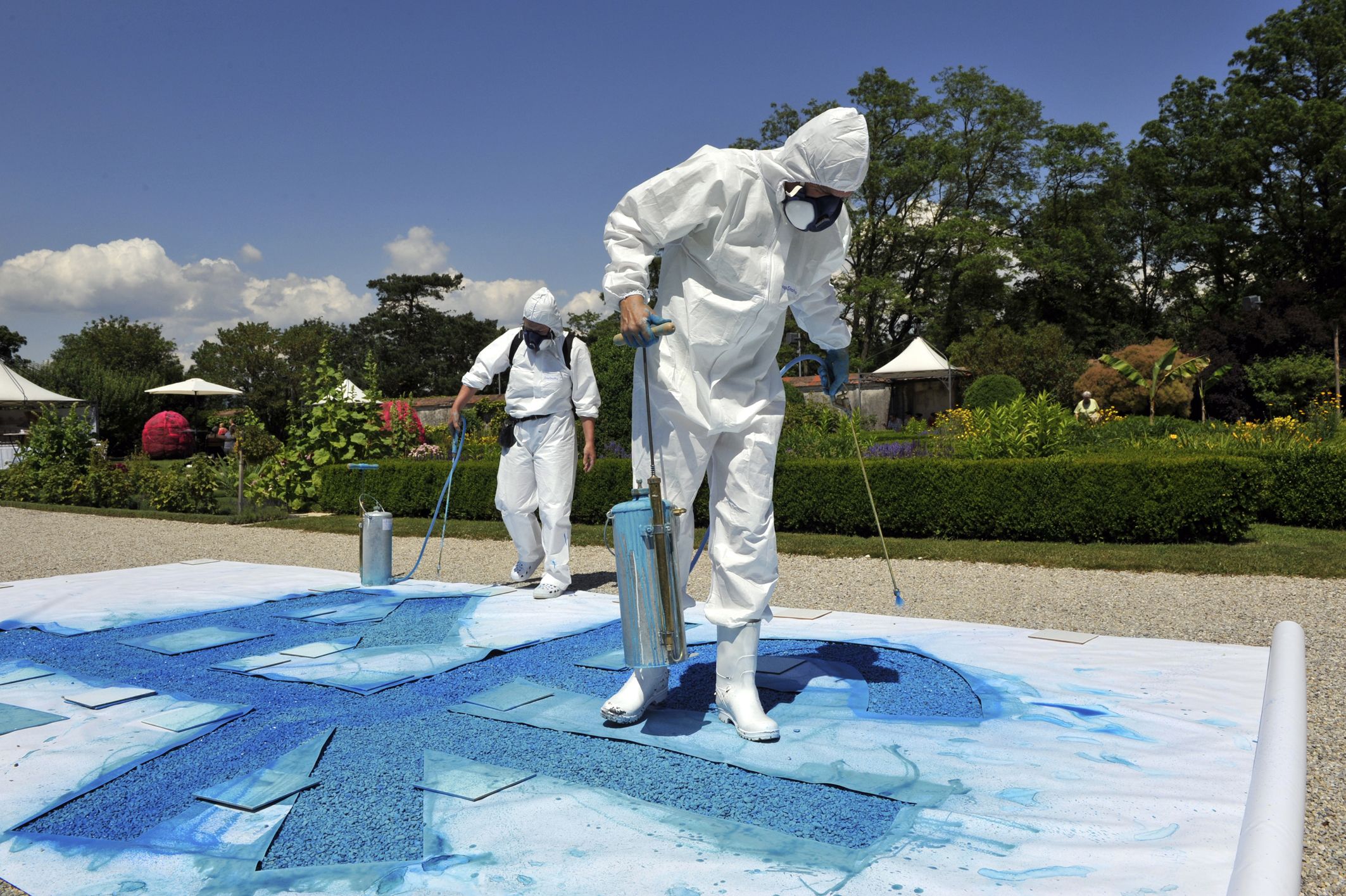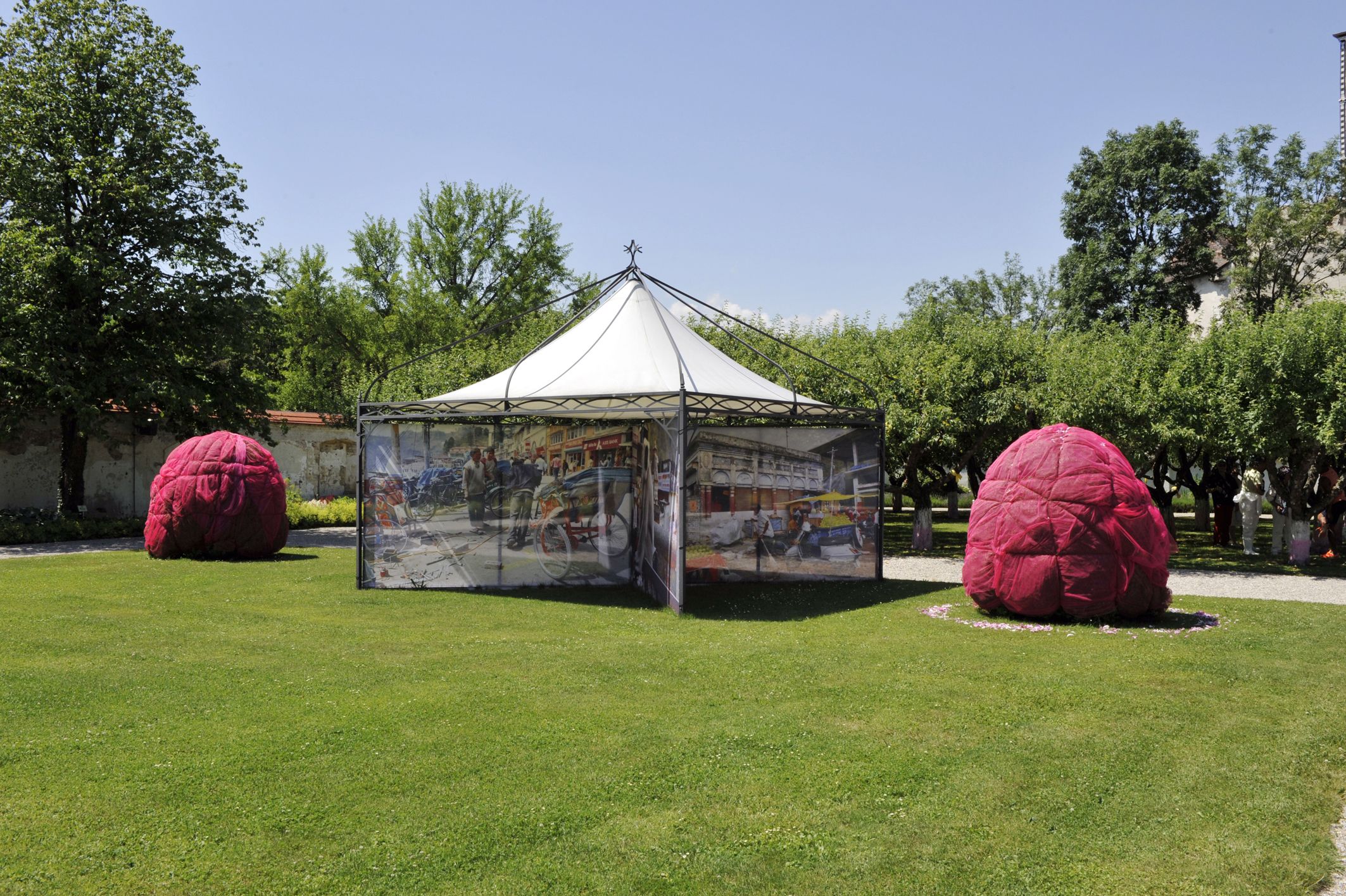 Time is the overarching theme that unites all six parts of the work. 1200 göttliche Jahre (1,200 Divine Years) is about the essence of a world that slowly but surely becomes part of, and affects us through, the unstoppable passing of time. 1,200 years is the duration of the current age of Kali Yuga (Iron Age) of Indian cosmology (in which time has a cyclical nature). It is seen as the last and shortest of four ages. "As time goes by" (Indian inscription) is written in sky-blue characters on the paths in the garden, fading a little more each time we walk over them. Eight boxtrees are wrapped in magenta colored fabric, standing out like powerful Shiva lingas (representations of the goddess Shiva in temples) that creating a frame for the open tents that display photographic scenes from today’s India: people working, children and mythological animals. The color-coded objects and the apple orchard in the background transform the entire scene into a garden of wishes where visitors can perform a wishing tree ritual according to Hindu tradition while doing some good work for children in Andhra Pradesh at the same time.